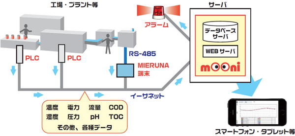 mooni(モーニ)とは、お客様の工場やプラント等で既存の生産設備・空調設備・電気炉・ボイラ・ポンプ・排水液備・その他各種設備や、加工装置等から現在の温湿度や・電気量・生産状況・各種測定値等のあらゆるデータを読み出して、 サーバにデータを構築します。構築したデータは簡単お手持ちのスマートフォンやタブレット・パソコン等でリモートでもモニタリングが出来るほか、アラーム表示等も可能な総合モニタリングシステムです。