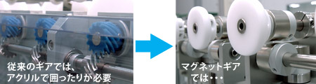 自社にて原材料より磁石を製造し、製品化までを一連の管理体制で生産する事により、 ギア単体の低コスト化を実現しました。また、従来のギアとベルト等を利用したクリーンルーム内の装置では、ギア等の接触部分をアクリルで囲って排気を取る等のクリーン対策が必要でしたが、その必要も無く低コストで 装置を実現できます。