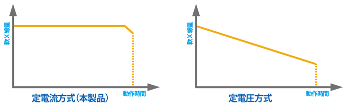 本製品の出力は、定電流方式により製品導入初期の除電性能が、X線管の寿命が来るまで安定して継続できます。